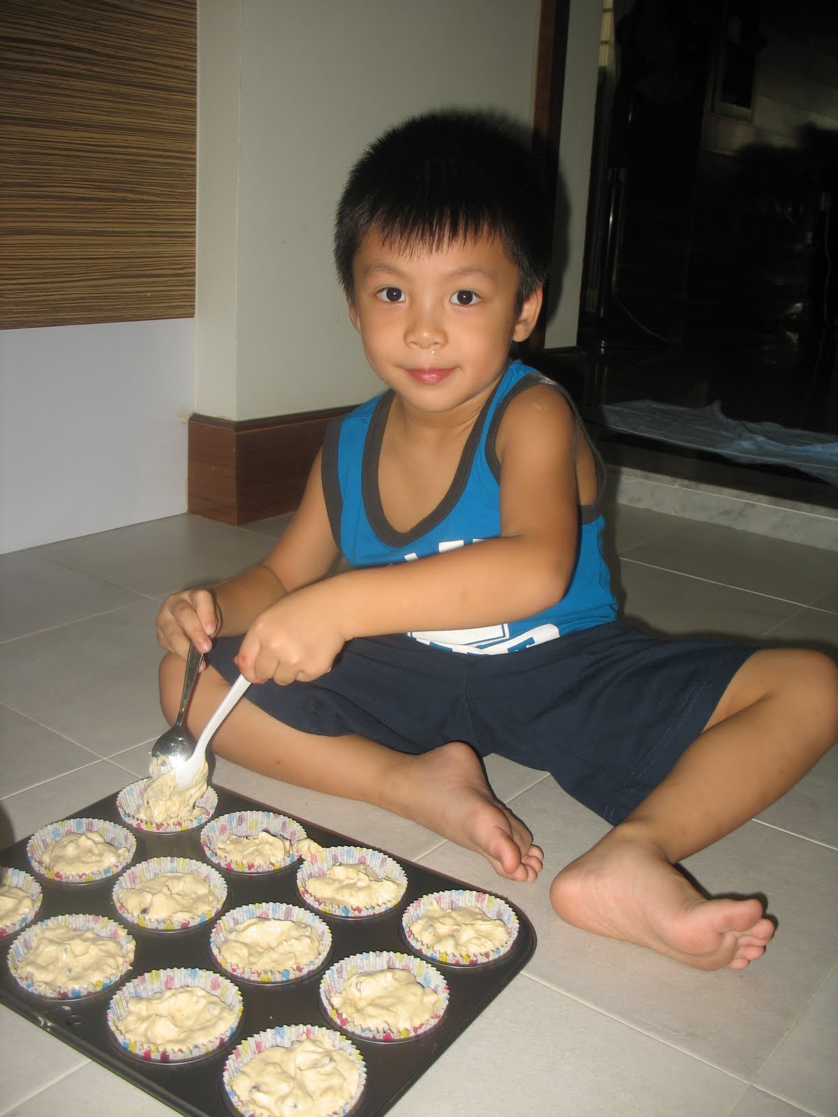It has been a while since I baked with Ezra... however this round I realised that I was able to involve him more besides just decorating the muffin after its cooked. He helped to sieve the flour, fetched the egg and even helped to crack an egg. He was very careful with the assigned task!!
